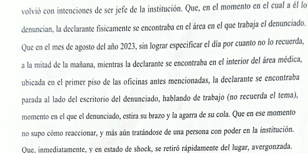 “En agosto de 2023 yo estaba en el área médica que funciona en el primer piso hablando con él de cuestiones laborales que ahora no recuerdo y, estando parada al lado de su escritorio él alarga la mano y me toca la cola. Te juro que no supe cómo reaccionar. Me sentí avergonzada y salí corriendo”, contó. Recordó que en esa ocasión en el mismo lugar había dos compañeras de trabajo. Pero no sería ese el único hecho que sufrió en presencia de sus compañeros.