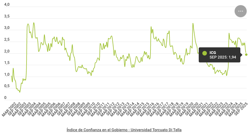 El Índice de Confianza en el Gobierno (ICG) de la Universidad Torcuato Di Tella mide cómo evoluciona la opinión pública sobre la gestión nacional, ofreciendo un termómetro político clave. Su evaluación se basa en cinco dimensiones —imagen general del gobierno, percepción del bien común, eficiencia del gasto, honestidad de los funcionarios y capacidad para resolver problemas— y se expresa en una escala de cero a cinco.
