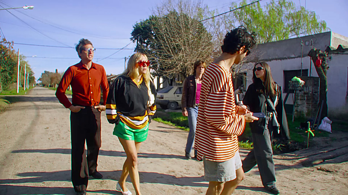 Toda la película tiene una plasticidad que responde a los parámetros de las redes sociales. Contrastes fuertes, filtros que irrumpen en las imágenes cotidianas que ya tienen un filtro cálido. Todo es instagrameable, Ulman emplea múltiples estilos: hay planos fijos con estética indie, cámaras GoPro montadas en perros callejeros, drones que sobrevuelan campos fumigados, lentes ojo de pez para distorsionar rostros, planos subjetivos y encuadres verticales como reels. Podemos inferir que esta búsqueda tiene relación con los trabajos previos de la directora en relación al NetArt, las redes sociales y la cultura pop. Así vemos que el montaje salta sin lógica aparente entre géneros: de falso documental a telenovela, de videoclip a documental. La película se construye como lo haría una story de Instagram: estética sobre ética, ritmo sobre contenido. Ejemplo de ello es cuando el productor filma un grafiti del pueblo, escrito en español porque le parece estético y cuando una de las chicas locales le dice el significado es: “Si te hace reir, chupale la verga”.