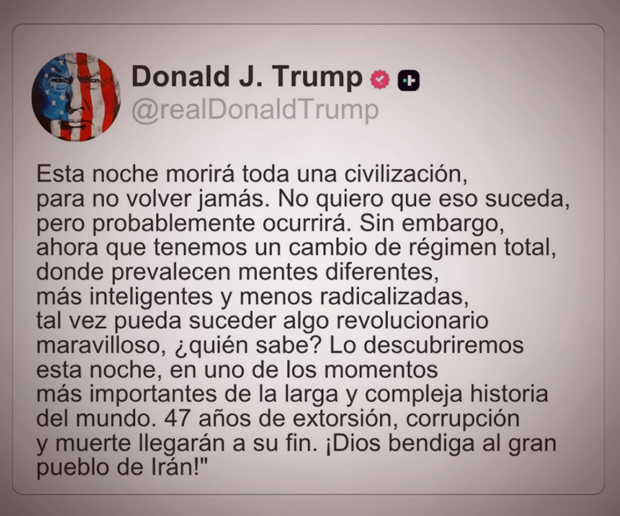“Toda una civilización morirá esta noche, para no volver jamás. No quiero que eso suceda, pero probablemente ocurrirá. Sin embargo, ahora que tenemos un Cambio de Régimen Completo y Total, donde prevalecen mentes diferentes, más inteligentes y menos radicalizadas, tal vez algo revolucionariamente maravilloso pueda suceder, ¿quién sabe?”, dijo el mandatario estadounidense.