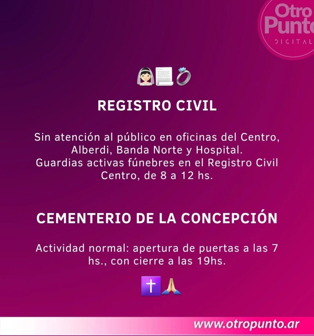 Registro Civil: Guardia mínima en el Registro Civil Centro. Guardia fúnebre en el Registro Civil Centro, de 08 a 12 hs.