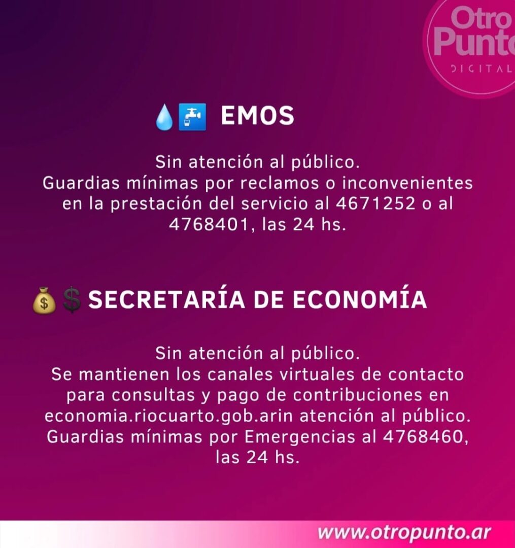 Sec. de Economía: Sin atención al público. | Se mantienen los canales virtuales de contacto para consultas y pago de contribuciones en economia.riocuarto.gob.ar