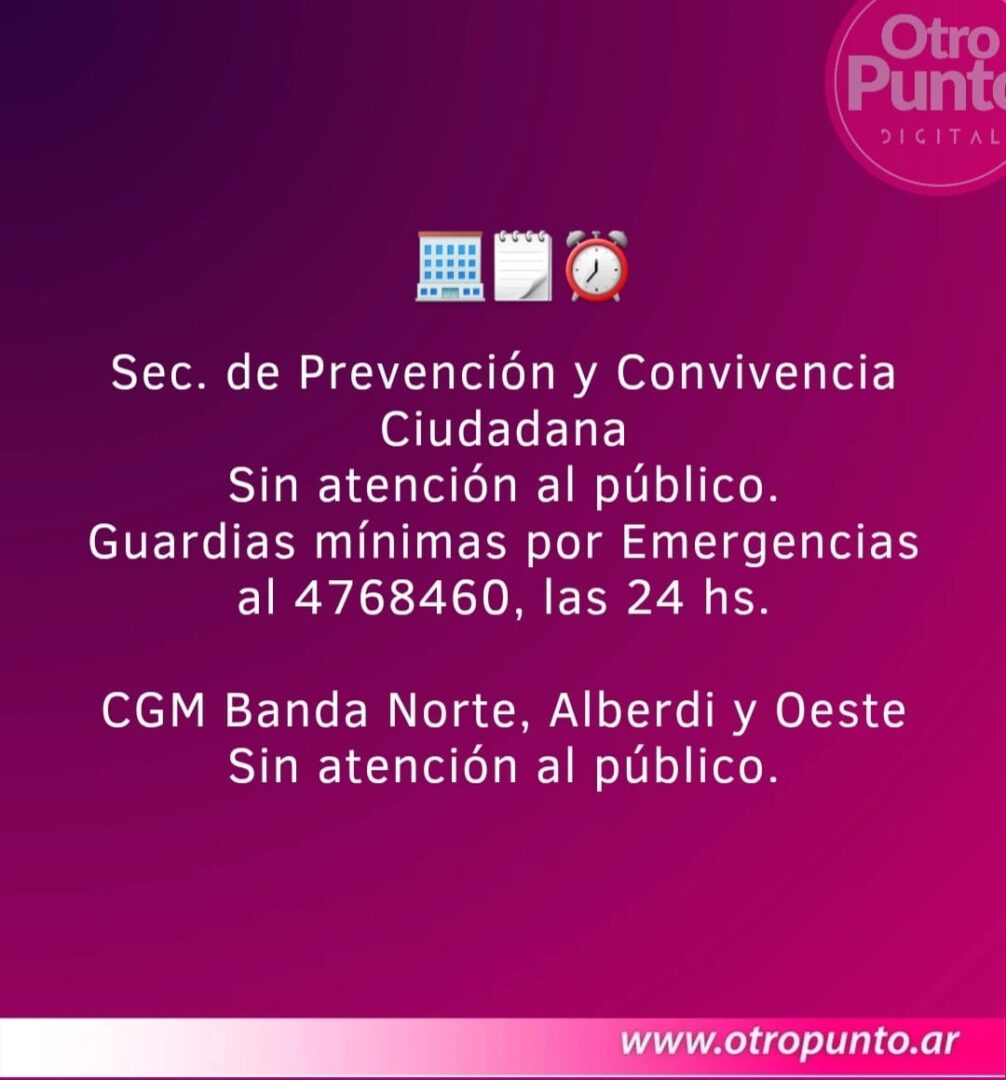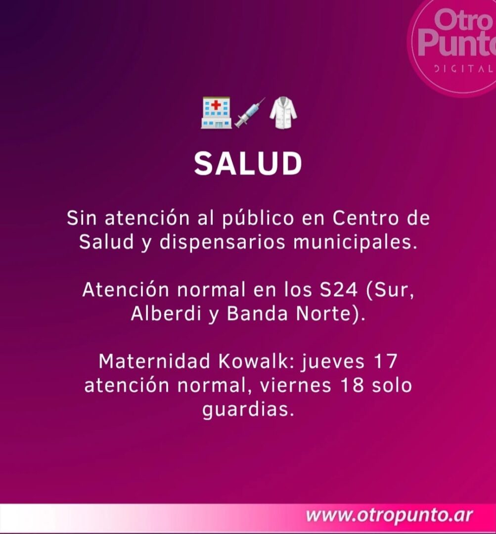 Salud: Sin atención al público en Centro de Salud y dispensarios municipales. Guardia normal en los S24 (Sur, Alberdi y Banda Norte). Maternidad: Jueves atención normal de guardias, consultorios, turnos y administración. Viernes solo guardias. Laboratorio cerrado jueves y viernes.