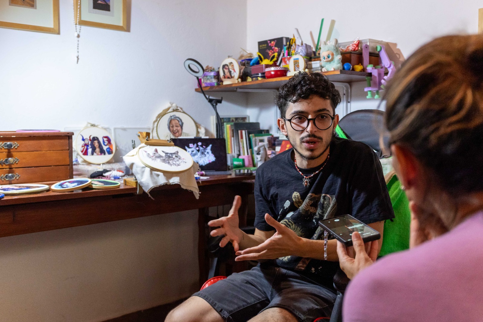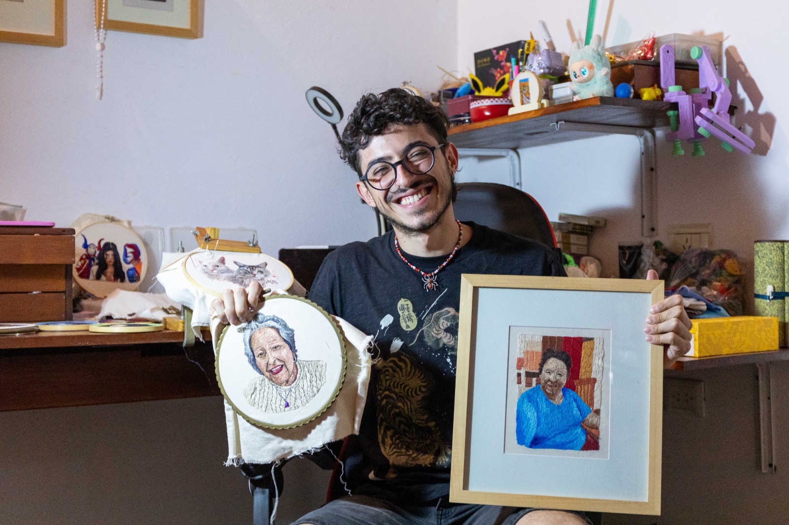 “En cada puntada, la siento cerca”, dice con cierta tristeza. Ella, quien falleció hace poco, fue una gran inspiración para él. Tejía y hacía arte con sus manos, también. La menciona durante la charla en varias oportunidades, incluso, un retrato suyo está colgado en una pared de la cocina, y otro, con el cabello entrecano, luce sobre un mueble, cerquita de las madejas de hilos violeta. La voz se le entrecorta y comenta: “Ella me apoyaba mucho, siempre ha sido muy compañera. Me decía que mi felicidad era la de ella. Ella tejía. Hacíamos trabajos juntos. A María Becerra le bordé una carta y ella me tejió el sobre de esa carta. El primer retrato que hice fue el de mi abuela”, recuerda con la emoción que brota en sus palabras.