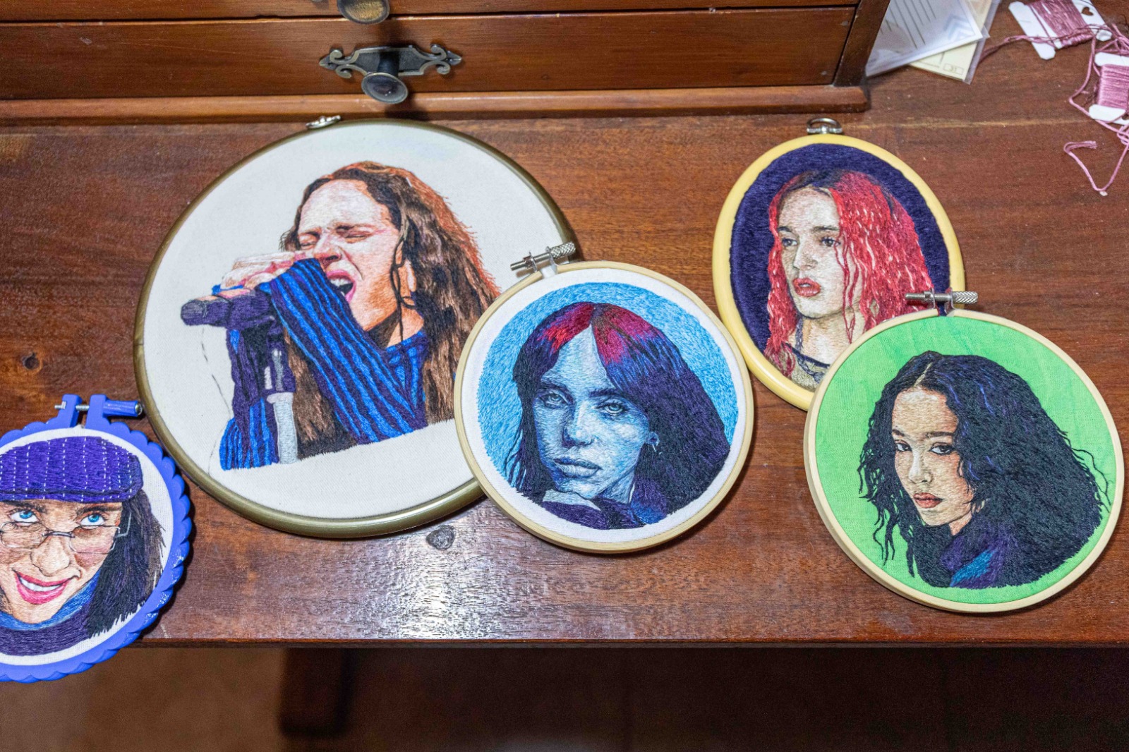 “Este es mi taller, acá está mi universo creativo”, dice con alegría genuina. Una silla, un escritorio, y cientos de hilos enrollados en pequeños compartimentos de madera. Ordenados por colores. Las agujas de coser también se abren paso para lucirse. la habitación, pequeña en metros, inmensa en puntadas. Se sienta en la silla y nos cuenta cómo arrancó su pasión de pintar con hilos.