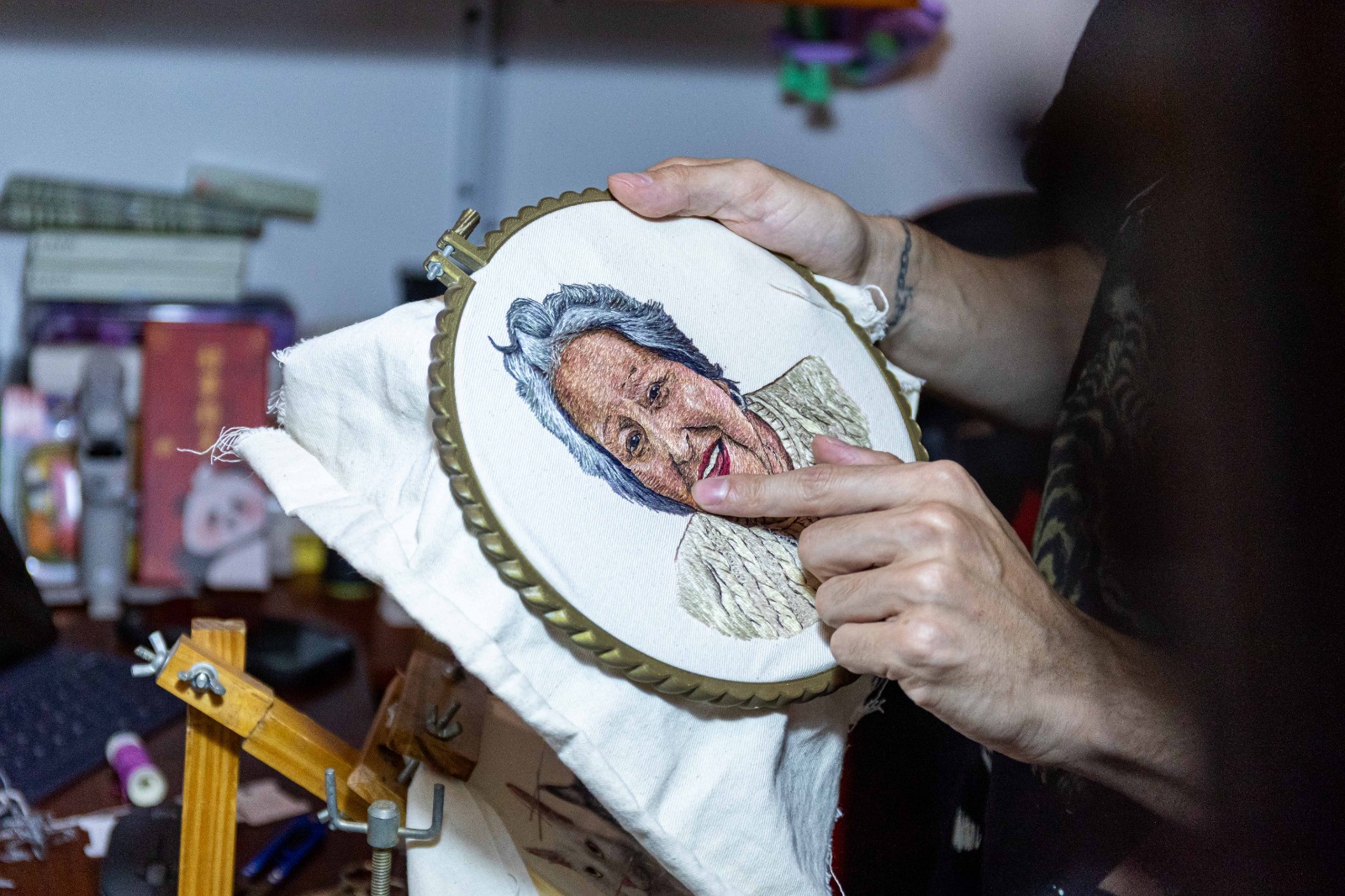 Tiene 31 años y es riocuartense. Trabajaba en un Call Center, decidió renunciar y cambiar su vida. Es Técnico en Artes Visuales y lo suyo era la pintura. Desde el 2021, se dedica al bordado realista y recibe encargos de todo el mundo. El recuerdo de su abuela y el viaje a Japón. Con la aguja, y una mirada sensible y transgresora, borda rostros, recuerdos y también su forma de ver la vida.